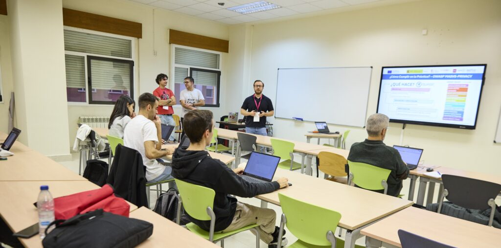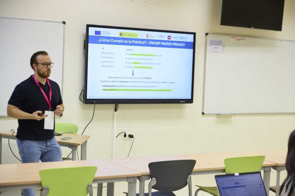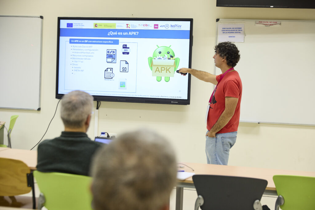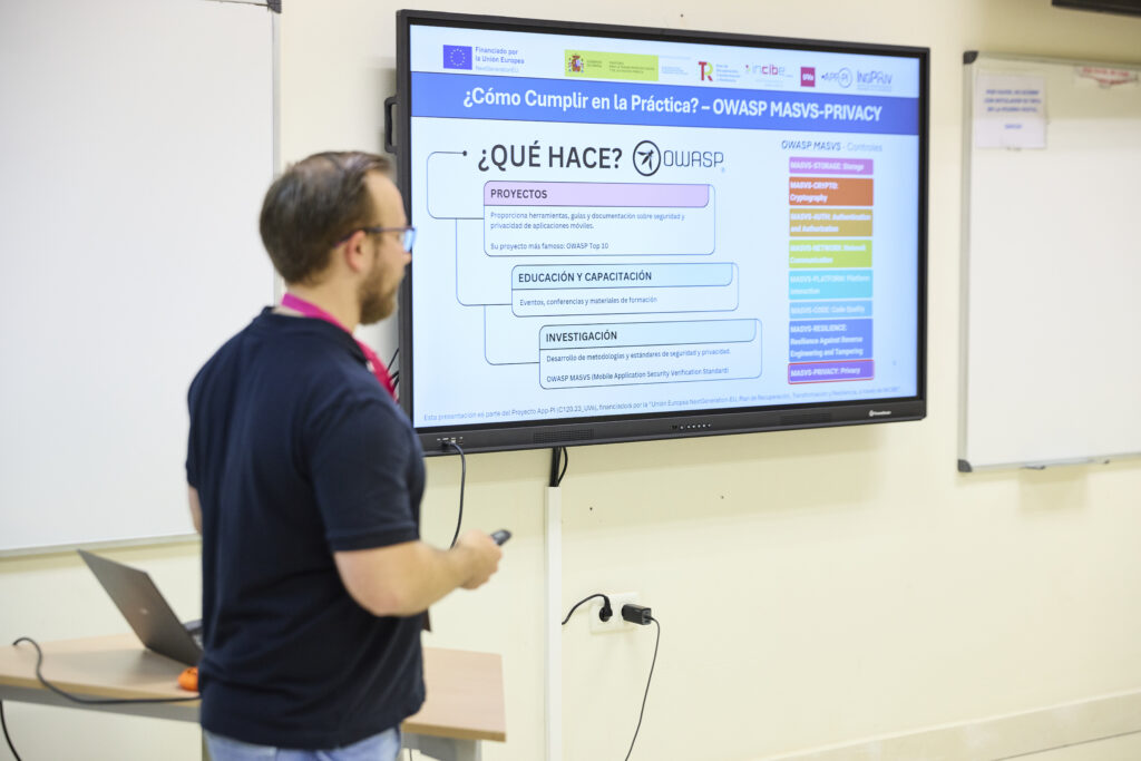 The session was led by Pablo Abel Criado Lozano, Alejandro Pérez de la Fuente, and Javier Rodríguez Aparicio, who introduced attendees to the essential techniques for auditing mobile apps from a technical, ethical, and privacy-oriented perspective.